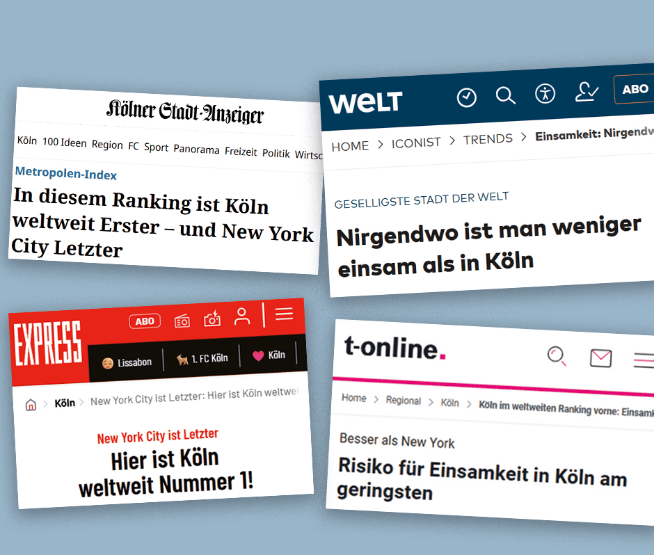 Die Menschen in Köln gelten als offen, gesellig und herzlich. An diesem Image arbeiten viele Kölner und die Stadt selbst – und auch die Lokalmedien. Die haben in einer neuen Studie nun den ultimativen Beweis für die Überlegenheit der geselligen Stadt am Rhein gefunden: „In diesem Ranking ist Köln weltweit Erster – und New York City Letzter“, jubelte der „Kölner Stadt-Anzeiger“ (KStA). Und die Schwesterredaktion „Express“ forderte gar: „Zeigen wir also, dass wir den Titel zu Recht tragen!“ Auch überregional wird berichtet. „T-Online“ bringt die Studie noch vor den beiden Lokalmatadoren. Und die „Welt“ fragt sich online nicht nur, wie Köln „im Kampf gegen Einsamkeit alle abhängt“, sondern lässt sich das auch von „Höhner“-Ex-Frontmann Henning Krautmacher ausführlich erklären.