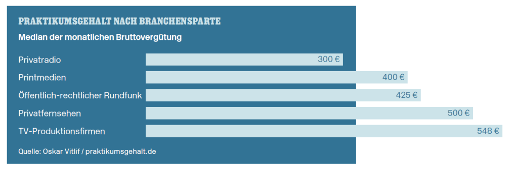 Viele zahlen gar nichts. In meiner Stichprobe sind das 184 Medienhäuser, also mehr als die Hälfte derer, für die ich die Konditionen für ein Pflicht- oder Orientierungspraktikum herausgefunden habe.